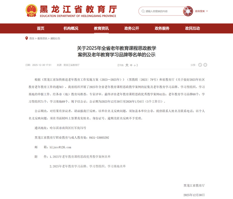 根据《黑龙江省加快推进老年教育工作实施方案(2023—2025年)》(黑教联〔2023〕79号)和省教育厅《关于做好2025年社区教育老年教育工作的通知》,我省组织开展了2025年全省老年教育课程思政教学案例的征集及老年教育学习品牌、学习型组织、学习基地的申报工作。经各市(地)教育局推荐,专家评审,最终评出老年教育课程思政优秀教学案例41份;老年教育学习品牌68个,学习型组织71个,学习基地69个。