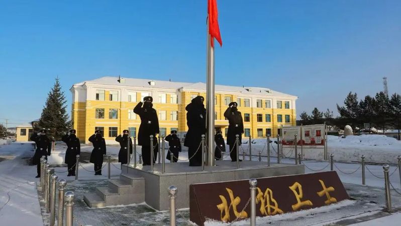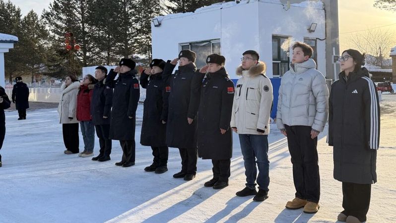 我校师生代表此次远赴漠河,冒着极寒来到漠河边境管理大队,与“最北国旗班”的戍边民警共同参与升旗仪式。在祖国版图的最北端,冰雪皑皑映衬着鲜艳的五星红旗,师生们亲眼目睹国旗在晨光中冉冉升起,亲身感受极寒环境下戍边民警守护国旗的赤诚。此次北极之行让师生们对国旗所承载的尊严与荣耀有了更直观的体悟,对戍边民警“以寒地为家、以守边为责”的坚守有了更深刻的震撼。当雄壮的国歌响彻极寒大地,国旗在民警手中舒展飘扬,庄严肃穆的氛围直击每一位师生心灵,让大家真切读懂了“祖国”二字的千钧重量,爱国情怀在冰雪中悄然升华。