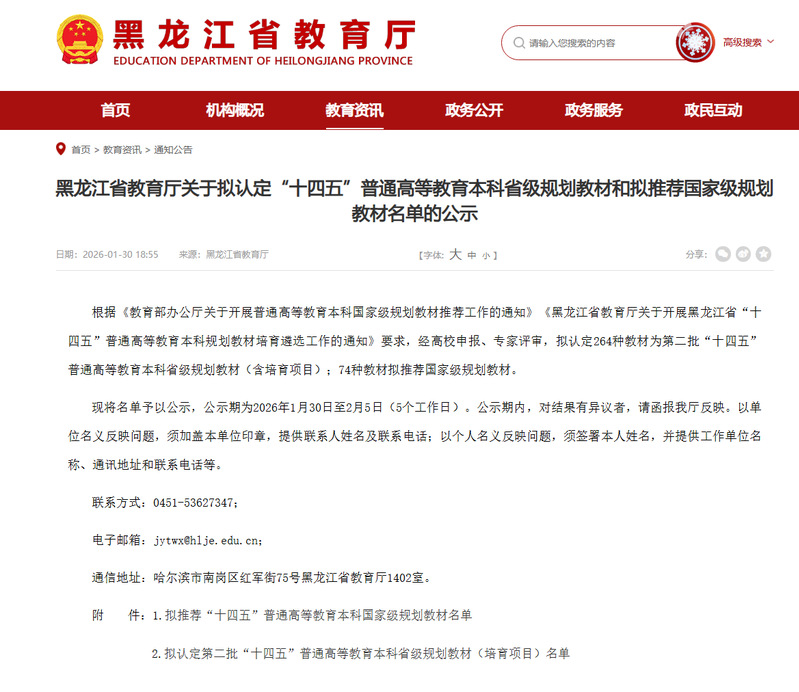 近日,黑龙江省教育厅公示了“十四五”普通高等教育本科省级规划教材及拟推荐国家级规划教材名单。我校教材建设再获佳绩,贺春英教授担任主编的《21世纪大学英语口语初级教程》(第二版)成功入选省级规划教材;洪港教授和贺树立副教授担任主编的《高等数学》(上册),以及赵佳音教授、柏洋、赵思洋副教授担任主编的《实用新闻播音主持教程》成功入选省级规划教材培育项目。