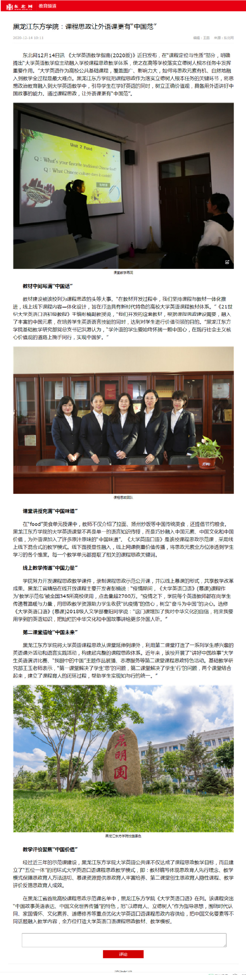 2020年12月14日《东北网》以“课程思政让外语课更有‘中国范’”为题,对黑龙江东方学基础教学研究部大学英语口语课程思政特色进行了报道。