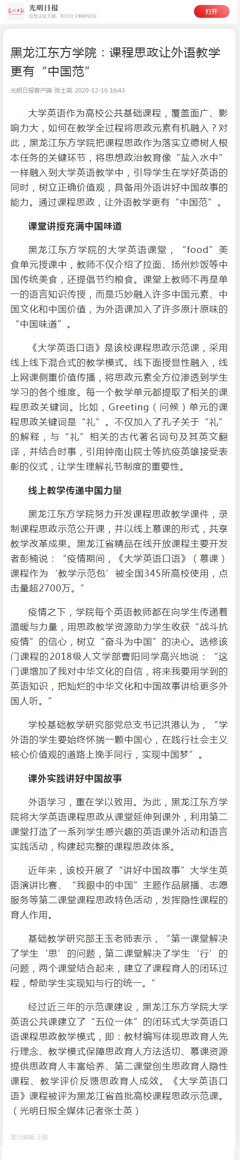 2020年12月16日《光明日报》客户端以“课程思政让外语教学更有‘中国范’”为题,对黑龙江东方学基础教学研究部大学英语口语课程思政特色进行了报道。