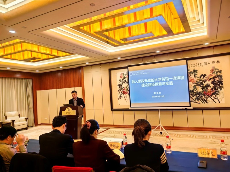 2024年3月15日,基础部副主任赵海龙教授在浙江杭州举行的“第⼗三届全国⼤学英语院/系主任⾼级论坛 大学英语教学改革与发展研讨会”上作主旨报告,主旨报告主题为:“融入思政元素的大学英语一流课程建设路径探索与实践”。