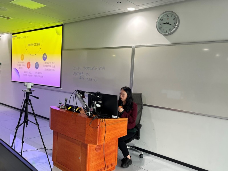郭晶副教授作主旨报告,主题为:“集成化数智课程教学平台应用介绍《新起点大学英语综合教程》”。
