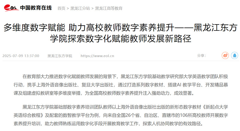2025 年 7 月 9 日,中国教育在线报道了黑龙江东方学院基础教学研究部大学英语教学团队在教育部大力推进数字化赋能教师发展背景下,携手上海外语音像出版社、复旦大学出版社,通过打造系列数字教材、搭建 AI 教学平台、开发精品慕课及组建虚拟教研室等多维度举措,为全国高校教师数字素养提升注入强劲动力,成效显著。