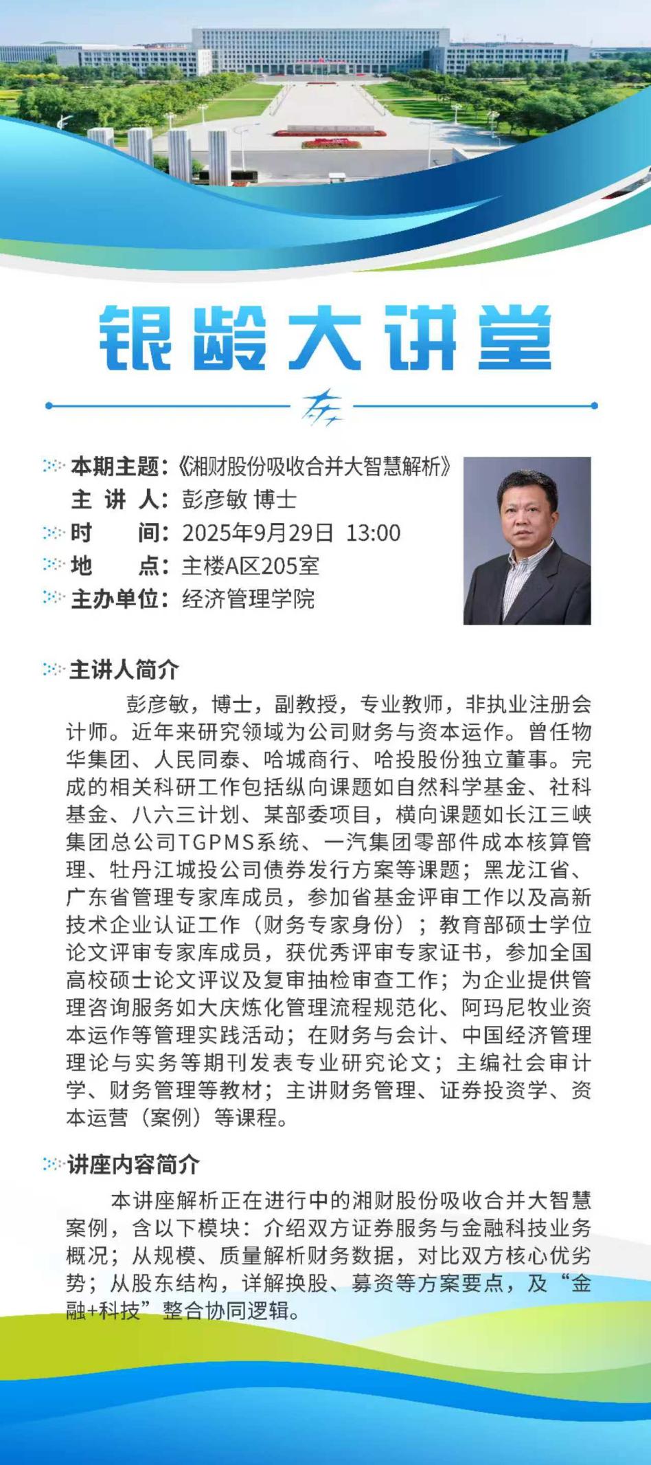 9月29日下午13:00,由经济管理学院主办的“银龄大讲堂”第十九讲在主楼A区205顺利举办。本次讲座以《湘财股份吸收合并大智慧解析》为主题,特邀我院银铃教师、黑龙江省/广东省管理专家库成员、教育部硕士学位论文优秀评审专家彭彦敏老师主讲,为关注企业资本运作与金融科技融合的同学们带来了一场干货满满的专业分享。