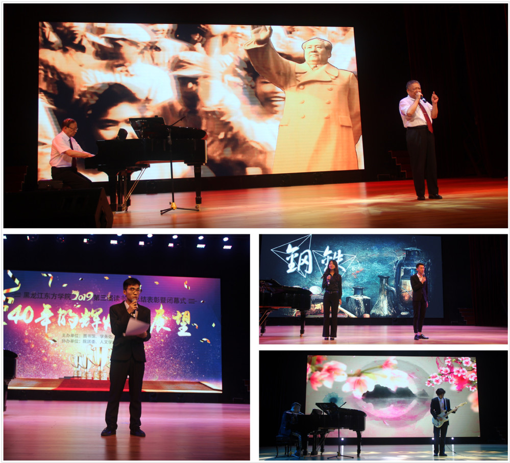 与会嘉宾为超星杯“经典咏流传”歌唱经典比赛、“知网杯”第十三届大学生读书征文比赛、黑龙江省高校图书馆博看“言为心声”朗读大赛、黑龙江省民办高校图书馆CNKI知识竞赛、全民首届“图书馆杯”全民英语口语风采展示活动等阅读推广活动获奖师生颁奖。获得一等奖的人文学部裴麒与贺鑫睿的原创歌曲《笔墨书香》,建工学部胡婷婷与张国昊的朗诵作品《钢铁》,人文学部苏奎的征文作品《我的家乡,让我魂牵梦绕的地方》等进行了现场表演。
