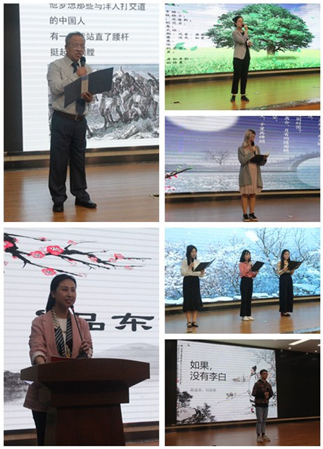 文学是没有国界的。我院的留学生同学也参加到此次的活动中来,来自俄罗斯的同学表演了《水调歌头·明月几时有》、来自韩国的三位同学共同表演了《沁园春·雪》,在现场与主持人互动的过程中,她们表达了对于中国经典诗文的理解和喜爱。在欣赏过多篇经典名篇后,人文学部刘家铭同学,展示了一首现代作品《如果没有李白》,人文学部教师孙琦也在现场倾情演绎现代散文《致橡树》。最后,陈光副院长声情并茂地诵读了现代诗《人民万岁》,“人民万岁!”铿锵有力的诗文与精彩诵读的表演使展演活动走向了高潮,掌声迭起。