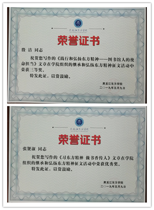 2019年5月8日,由学院党委宣传部组织开展的《继承和弘扬东方精神》主题征文活动圆满落幕。图书馆馆员殷洁的征文《践行和弘扬东方精神——图书馆人的使命担当》荣获三等奖,张贤淑的征文《习东方精神做书香传人》荣获优秀奖。
