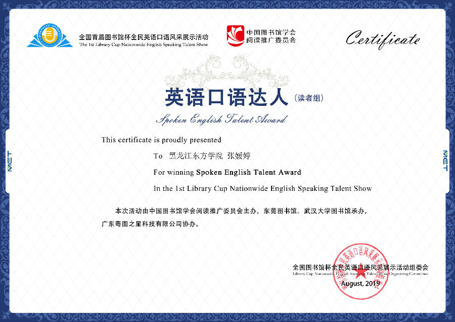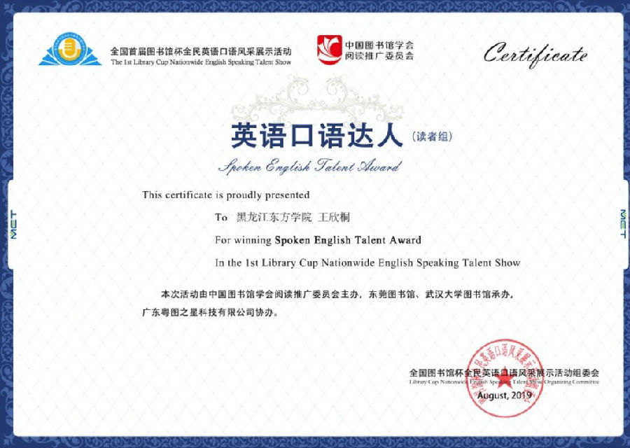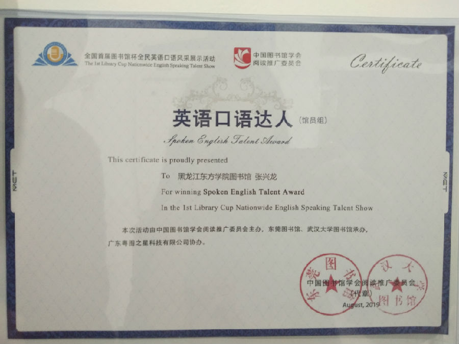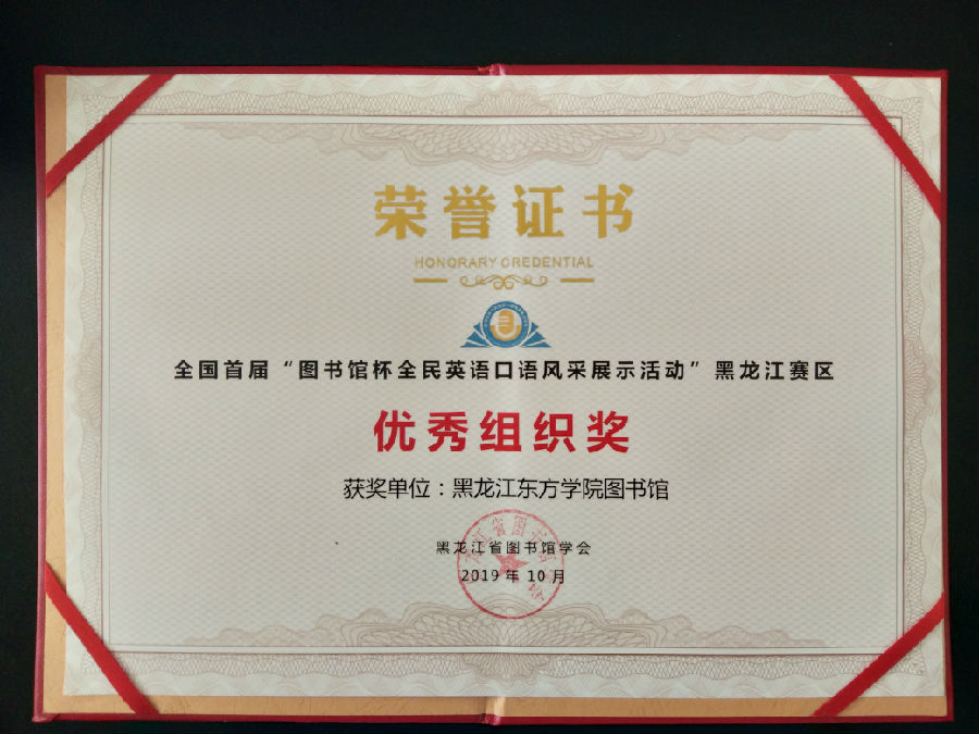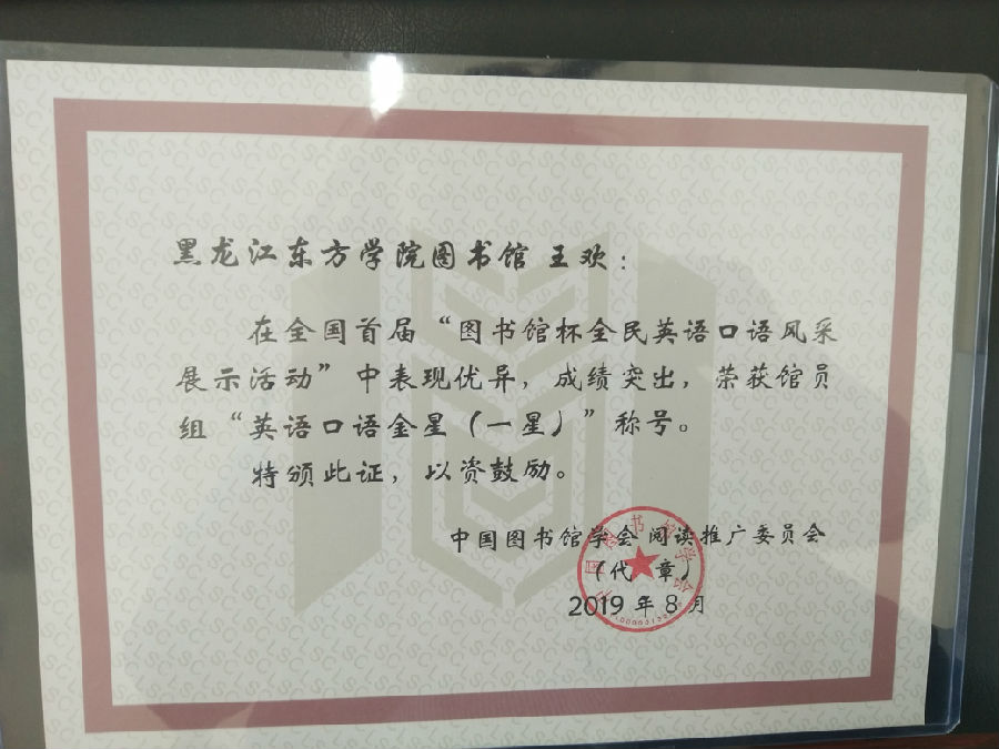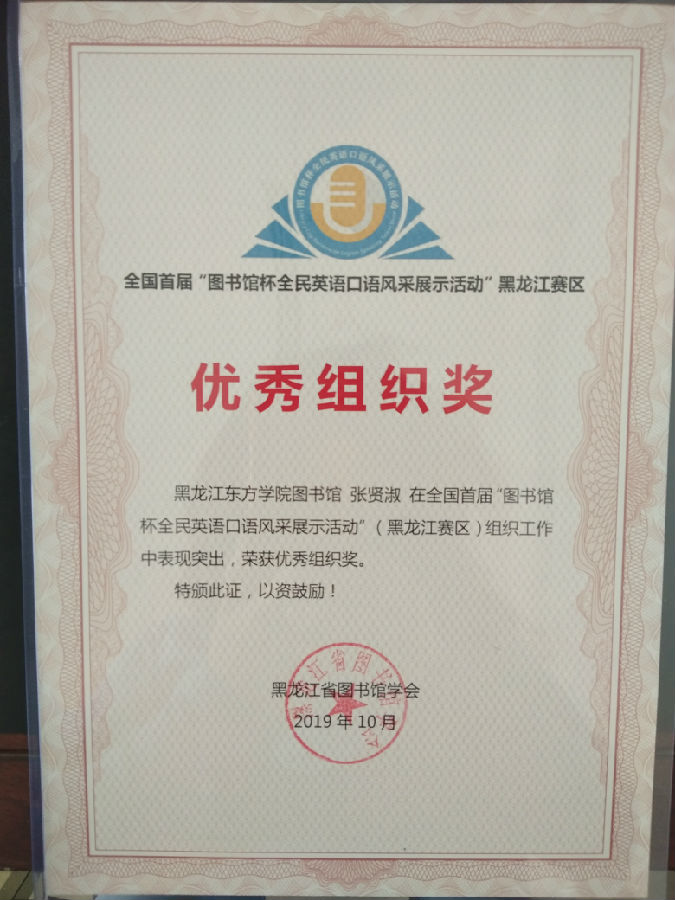 我院图书馆与外国语学部联合组织参加该项活动,共有161位师生参赛,其中外国语学部王欣桐、张立娜、张媛婷、赵甜甜四位同学获读者组“英语口语达人”称号;馆员王欢获馆员组“英语口语金星(一星)”称号,馆员张兴龙获 “英语口语达人”称号;参考咨询部主任张贤淑获“优秀组织奖”,我院图书馆集体获“优秀组织奖”。