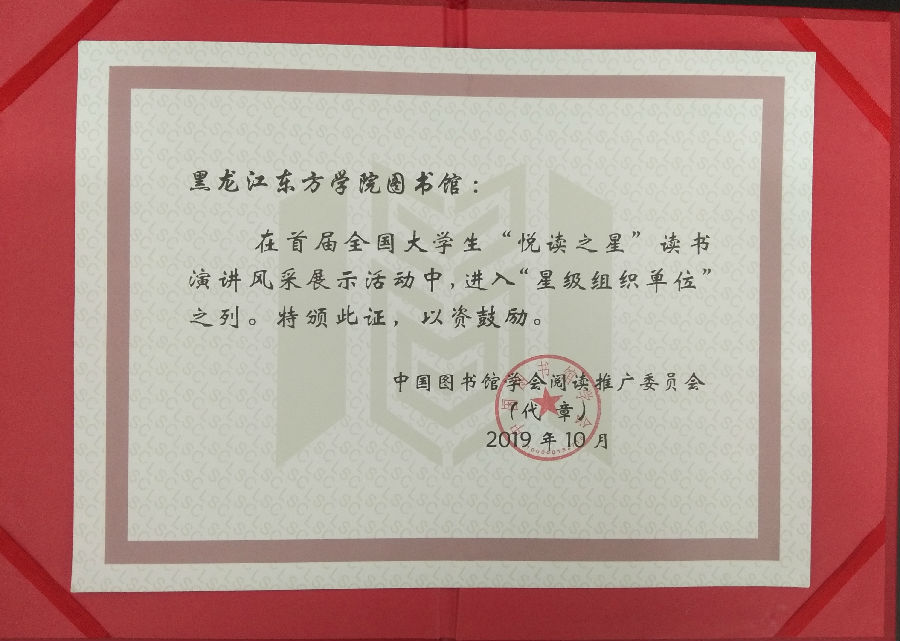 近日,在由中国图书馆学会阅读推广委员会主办, 武汉大学图书馆、天津财经大学图书馆承办的首届全国大学生“悦读之星”读书演讲风采展示活动在天津财经大学落下帷幕,我院图书馆荣获“星级组织单位奖”。