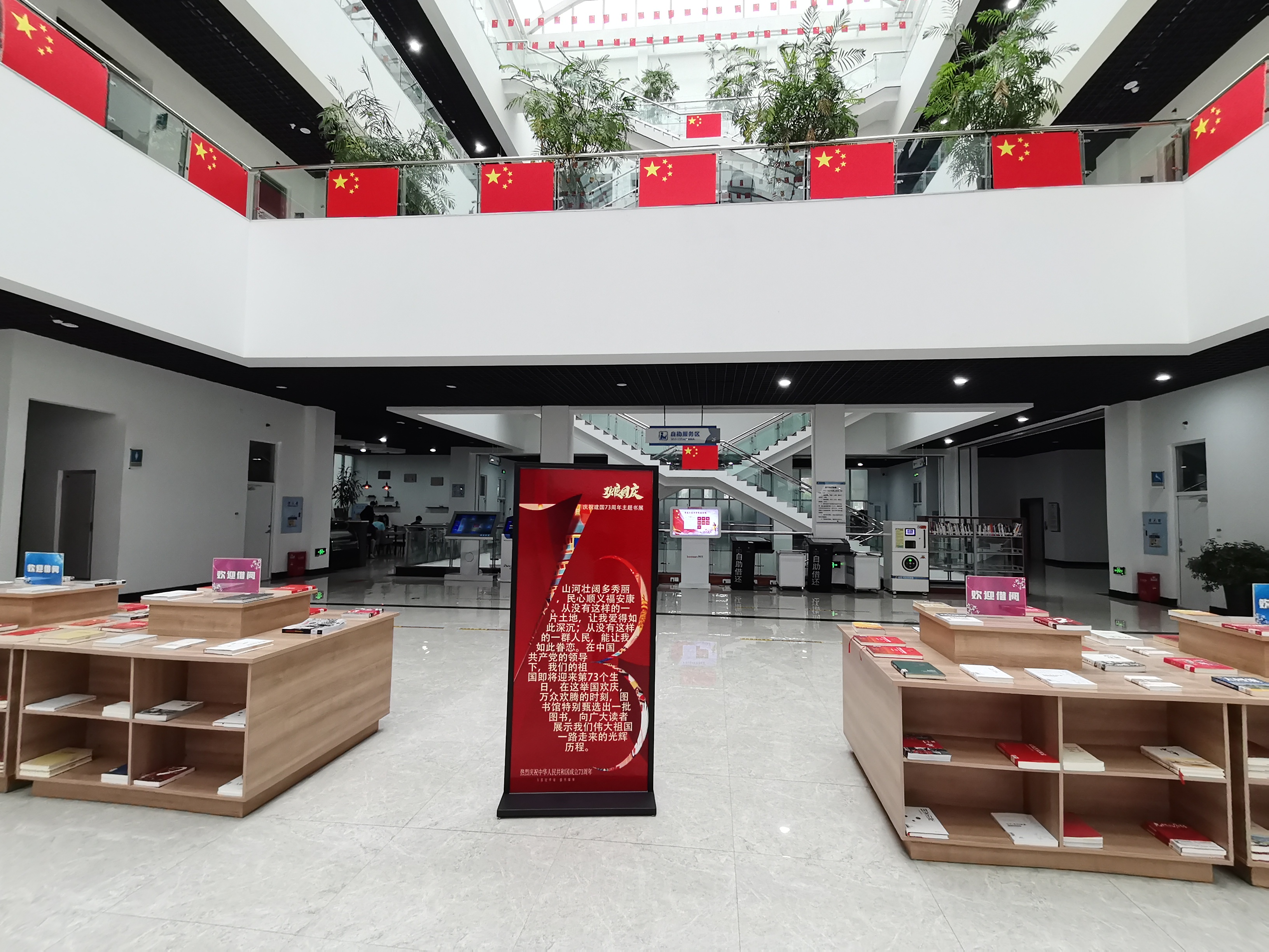 为迎接祖国第73个生日和中共二十大的到来,营造浓厚的节日氛围,图书馆“挂国旗,办书展”,从中国红,到中国魂,让出生在山河壮阔、国富民强新时代的同学们,也通过书展了解国家和党的光辉历程。