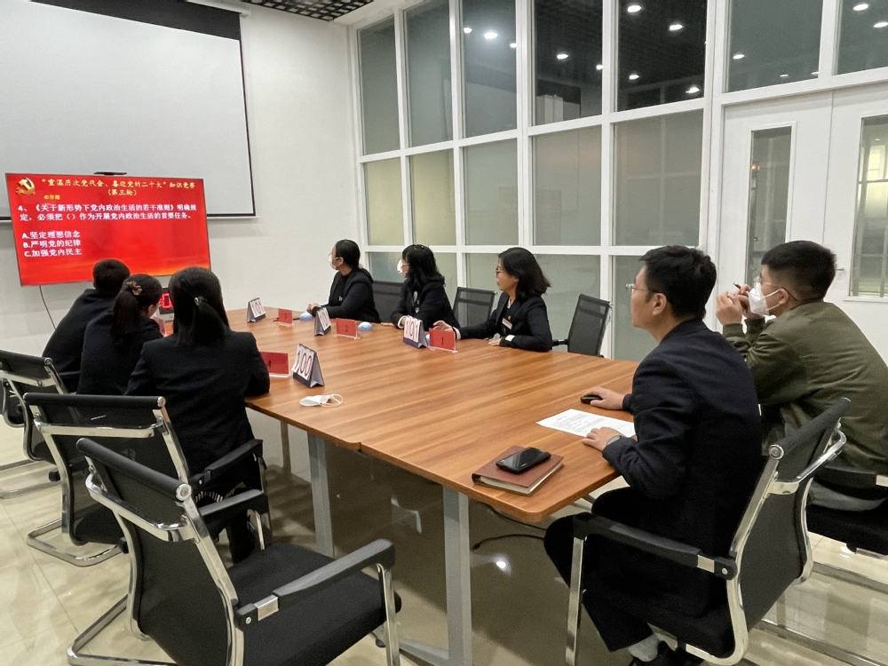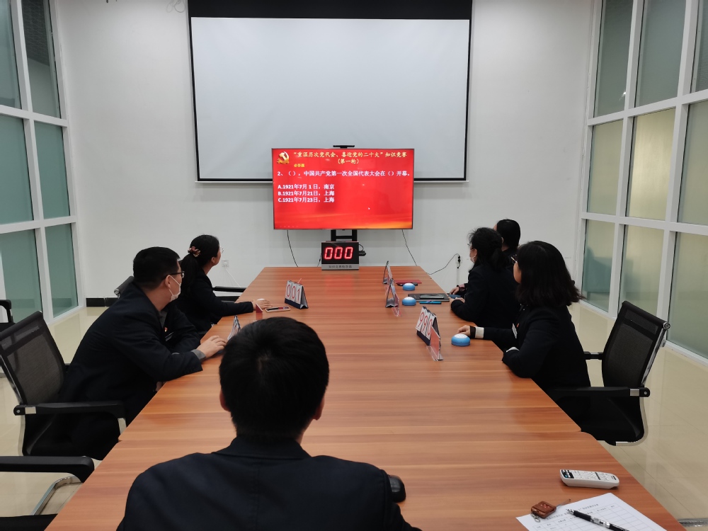 第二个主题活动是“重温历次党代会、喜迎党的二十大”知识竞赛。比赛分初赛和决赛,初赛以小组为单位,每组分别有必答题和抢答题,从120道题库中抽取,基础分100分,答对加1分,答错扣1分。经过三轮的激烈比拼,最终杨以明、张贤淑、殷洁三位同志分别获得前三名。
