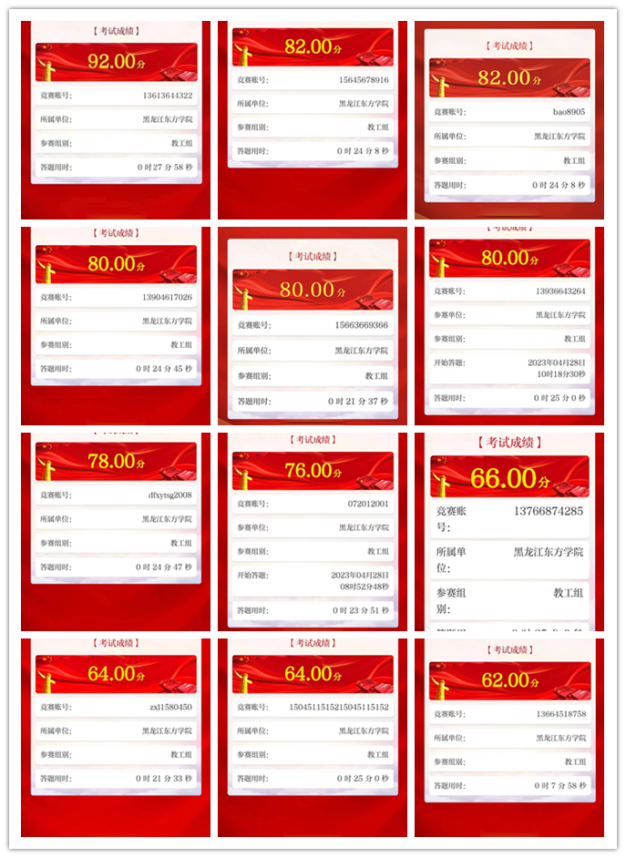 本次竞赛所采用的试题均来源于“思政课”和“红色讲堂”数据库,内容涵盖习近平新时代中国特色社会主义思想、党的二十大报告、《中国共产党章程(修正案)》、中国共产党人精神谱系等。支部党员在4月27日-30日期间,通过“思政课”或“红色讲堂”数据库微信端登录竞赛考场,在教工组参加竞赛答题。党员们赛前进行了认真学习,如期完成竞赛答题取得优异的成绩。