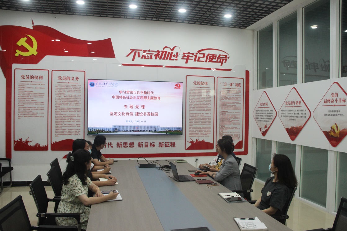 6月19日,图书馆馆长郭健民为支部党员主讲党课“坚定文化自信、建设书香校园”。党课第一部分讲了习近平总书记关于教育的重要论述,让党员们对教育内涵的理解更加深入;第二部分从坚持文化自信、建设书香校园的角度,讲了国家对全民阅读的重视、习近平总书记的读书观、与图书馆的渊源,以及高质量发展的时代背景下图书馆的发展契机,也让全体党员对图书馆员今后的职业发展前景有了更明确的方向。