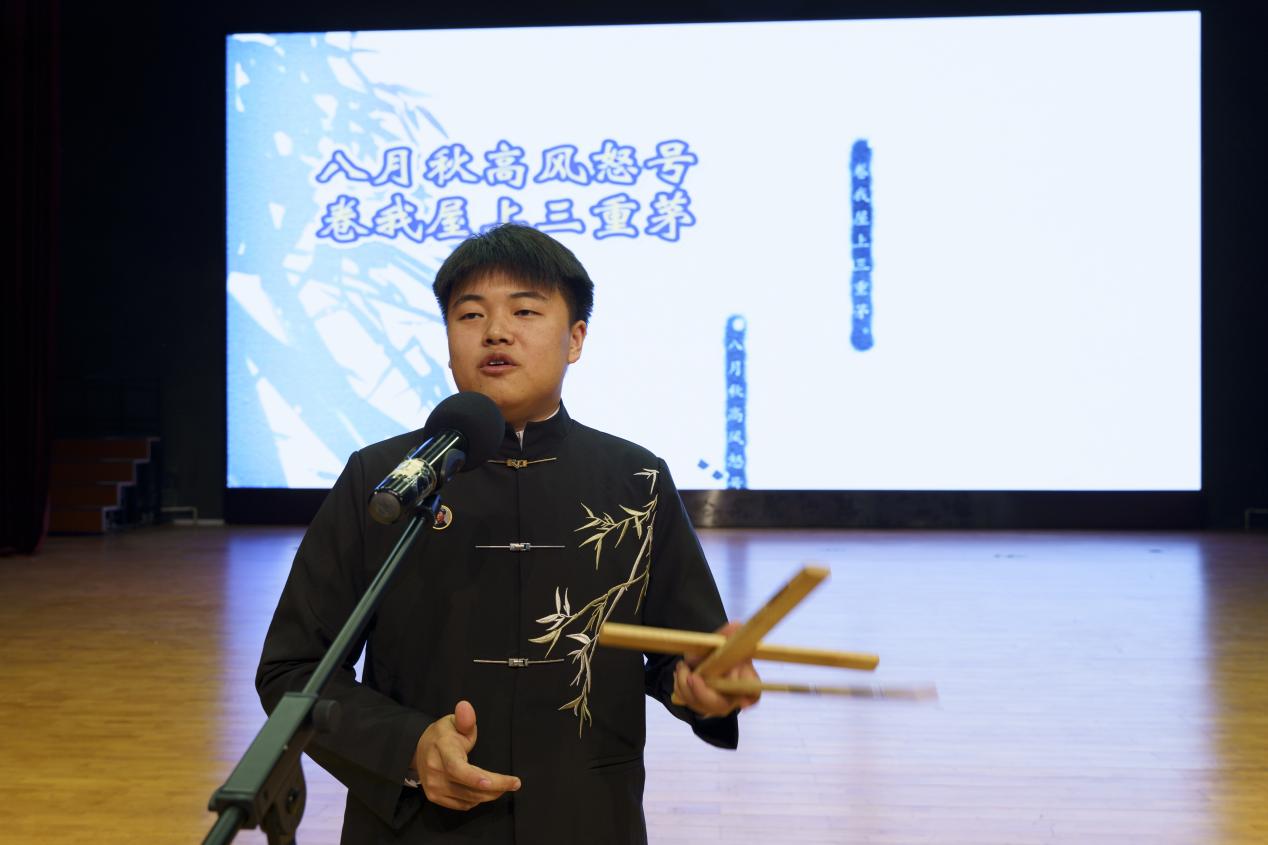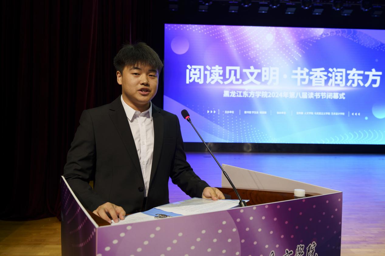 2022级经济贸易学院金融学专业廖学李代表获奖学生发言,读书节的平台让他们可以展示才华、交流思想,活动虽然结束了,但求学之路永无止境。号召同学们要将读书作为一种习惯,一种生活方式,也要将读书的精神传递给更多的人,激励更多的人加入到读书的行列中来,共同感受书籍的魅力,在书香文墨里,认识世界,成就自己。
