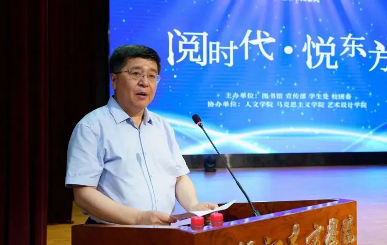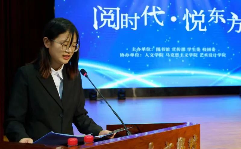 学生代表、人文学院王一舟同学的发言表达了同学们喜欢读书活动的心声,用读书优化知识积累,滋养纯净心灵,助力修身养性,培养高尚情操。