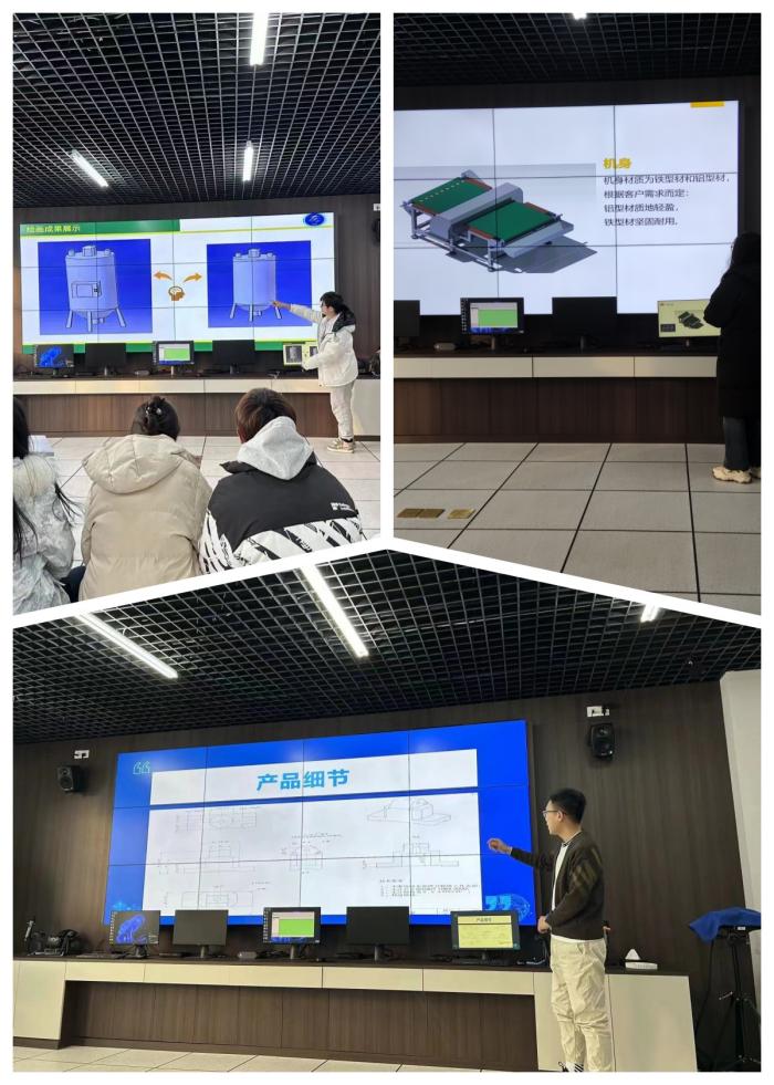 活动中,同学们汇报了精心设计的各类机械产品,包括储奶罐、传送带机床、农作物守护机器人等。