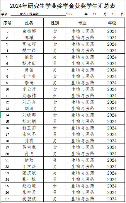 为激励学生勤奋学习、努力进取,食品工程学院严格按照公平、公开、公正的原则开展研究生学业奖学金评审工作,在个人申请的基础上,于2025年11月10日一教学楼348开展食品工程学院2023学年度学业奖学金评议会,经学院研究生学业奖学金评审小组审核,评选出2024级研究生27人符合学业奖学金获得标准,2025级研究生一等学业奖学金13人,二等学业奖学金18人,拟推荐至学校。现予以公示。
