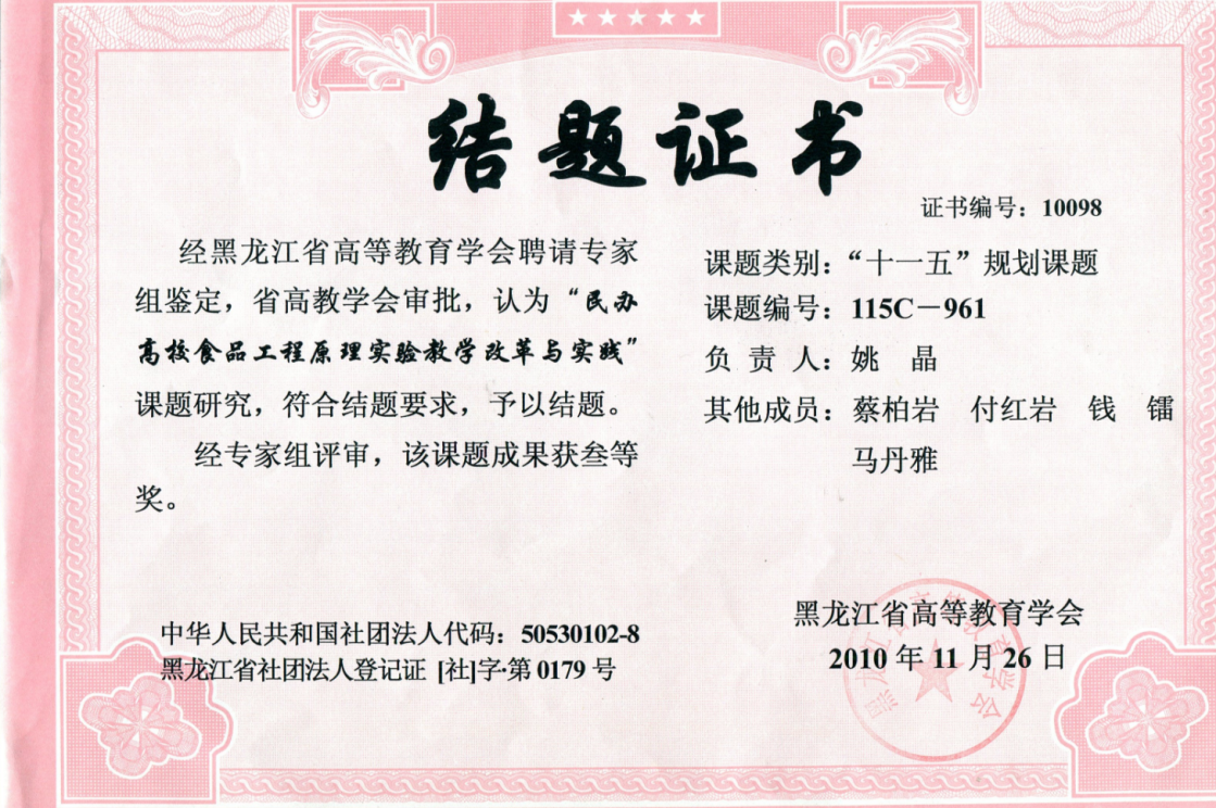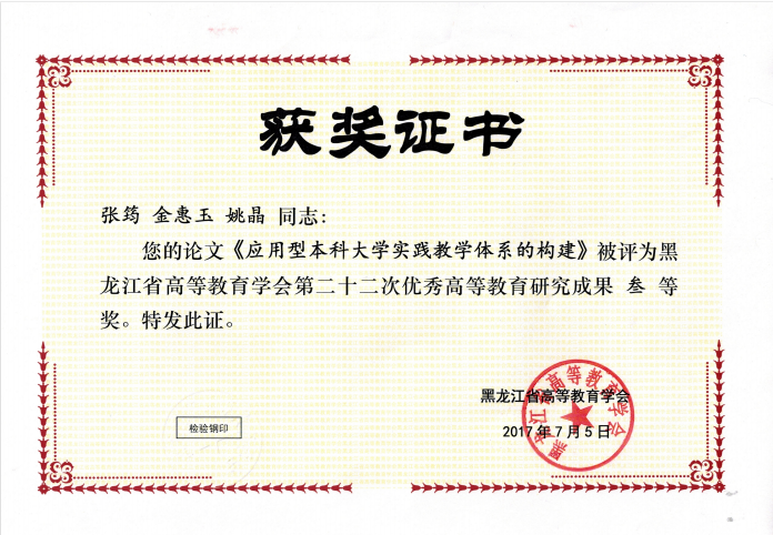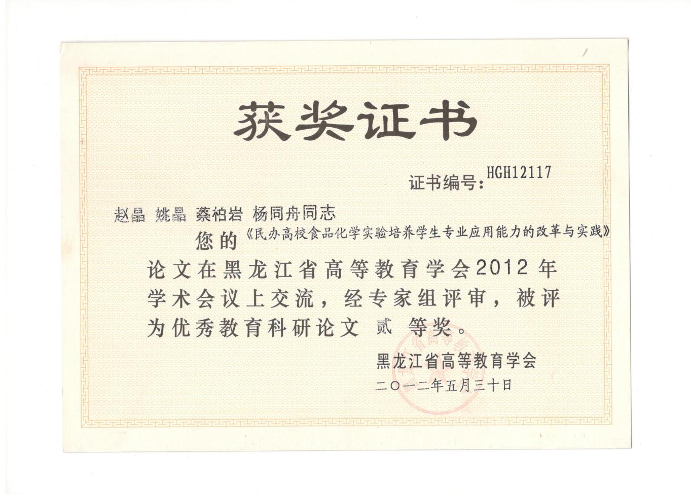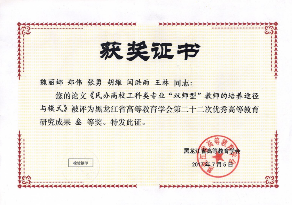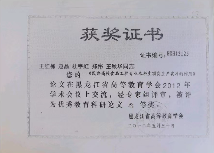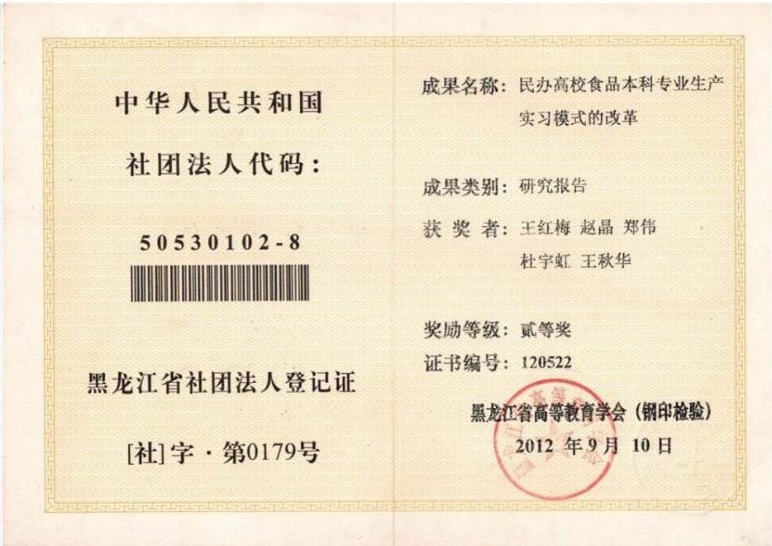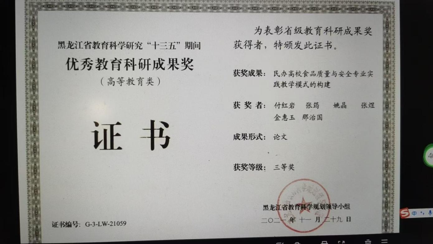2、《民办高校食品质量与安全专业实践教学模式的构建》获黑龙江省教育科学研究“十三五”期间优秀教育科研成果奖(高等教育类)