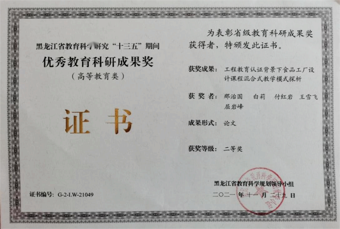 1、《工程教育认证背景下食品工厂设计课程混合式教学模式探析》黑龙江省教育科学研究“十三五”期间优秀教育科研成果奖(高等教育类)