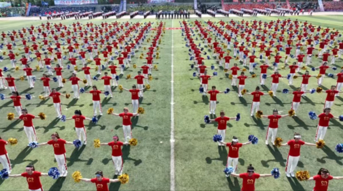 炫彩的烟火与祥云为伴,俏皮吉祥物四溢着夏日的欢乐,鲜艳的服装、整齐的坐姿显示不可阻挡的力量。