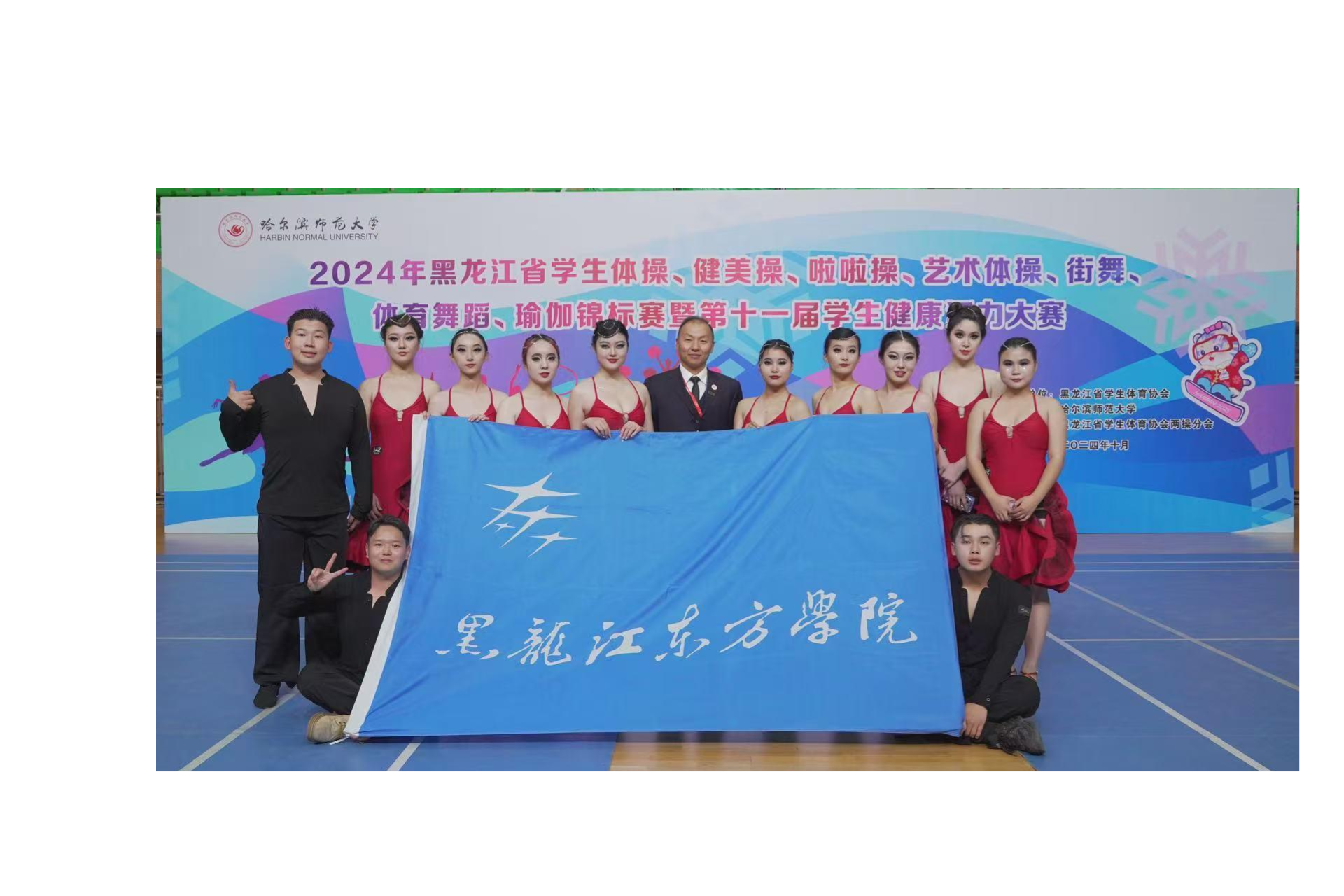 2024年10月12号下午,在师大体育馆(江北校区)举行了2024年黑龙江省学生体育舞蹈锦标赛暨第十一届健康活力大赛。本次大赛共有全省各大中专院校以及中学共计39支代表队,1200余名运动员参赛。我校体育舞蹈队12名队员发扬东方体育的拼搏精神,在教练员付雷老师的带领下,取得了优异的成绩!