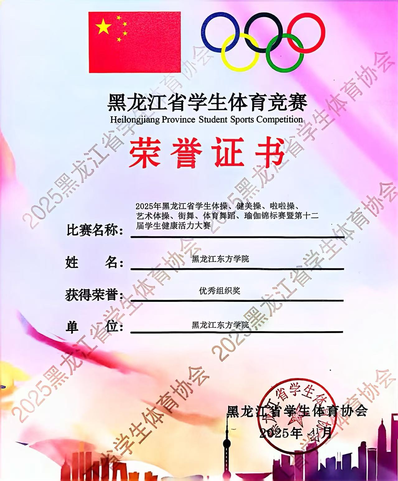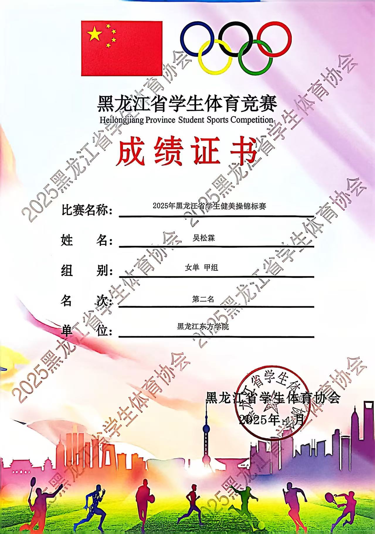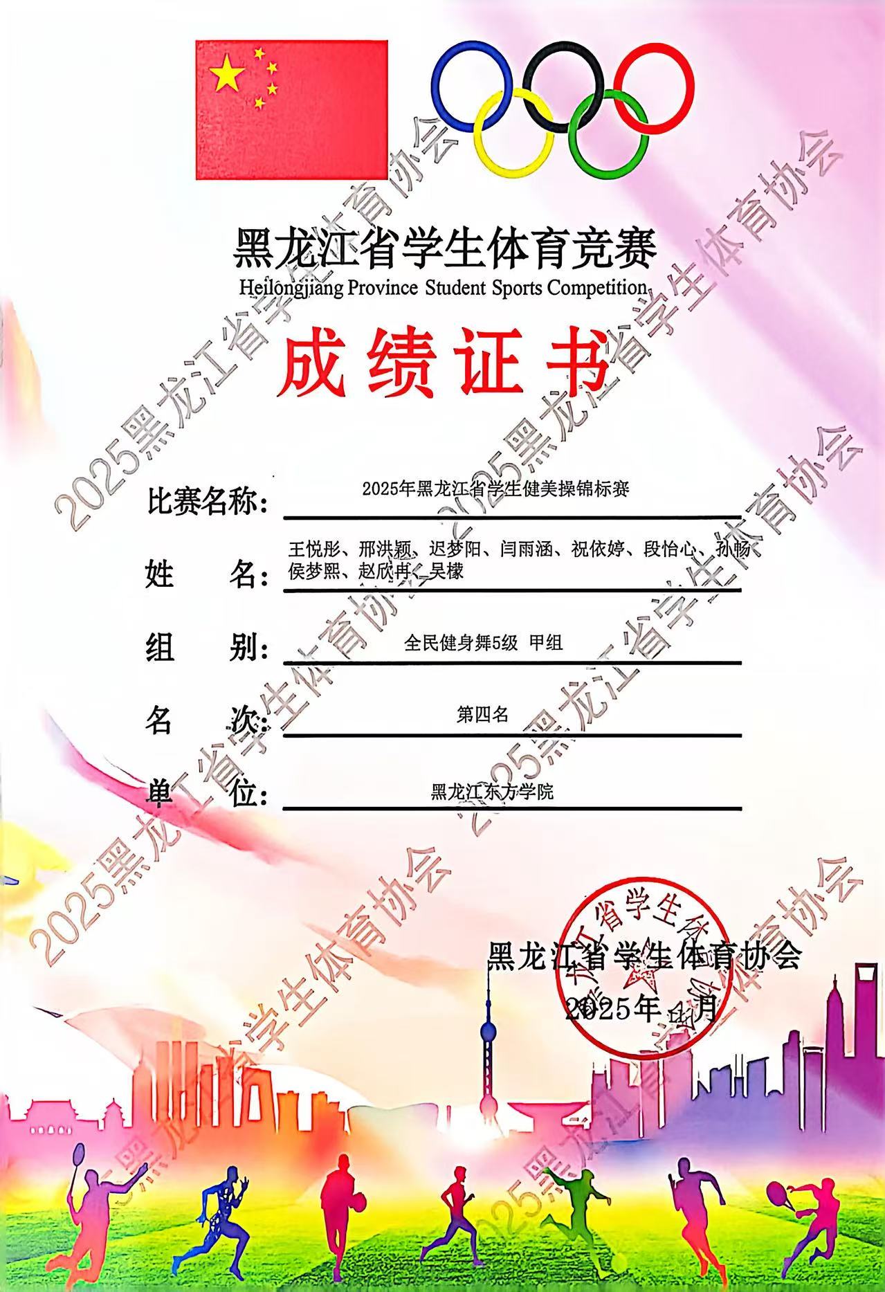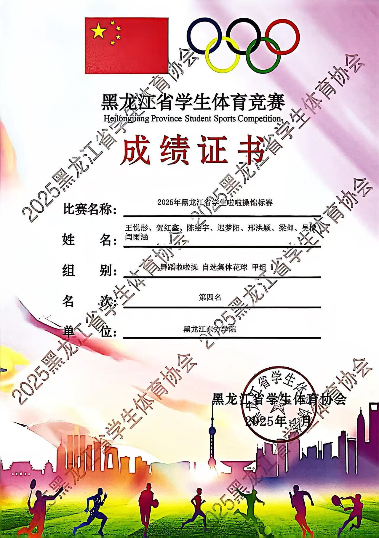 2025年11月9日,黑龙江省第十二届学生健康活力大赛在哈尔滨广厦学院艺体馆落下帷幕,黑龙江东方学院健美操队以昂扬的斗志、精湛的技艺和出色的表现,再次展现了东方学子的风采,成为赛场上一道靓丽的风景线! 体育军事教研部李征宇主任参加开幕式,并亲赴比赛现场指导,为运动员们加油。