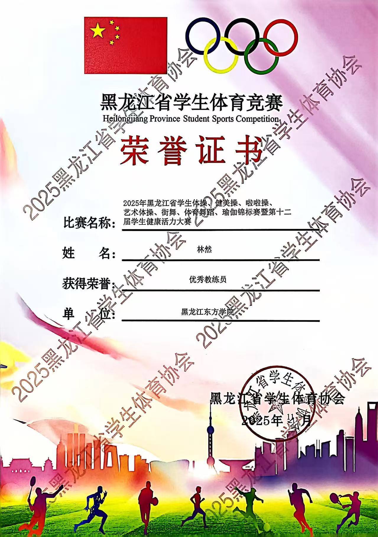 这支充满活力与激情的队伍共23名运动员,由体育军事教研部林然教授担任教练员。历经两个多月的刻苦训练,他们用汗水浇灌梦想,用拼搏诠释青春,与来自全省高校的各路强队同台竞技。最终斩获3项第一名、3项第二名、两项第四名和1项第五名的辉煌战绩!我校获评优秀组织奖,林然老师获评黑龙江省优秀教练员。