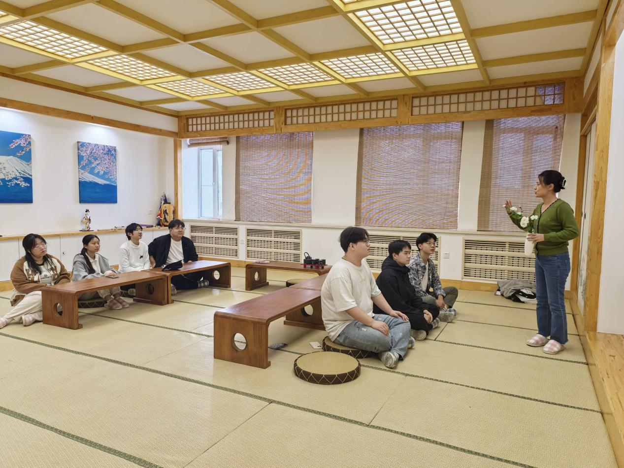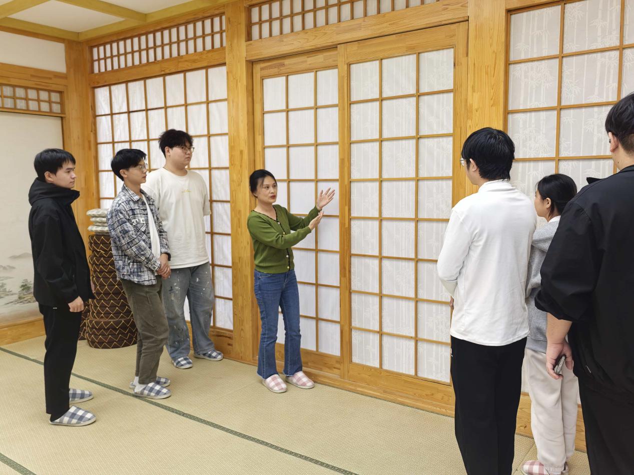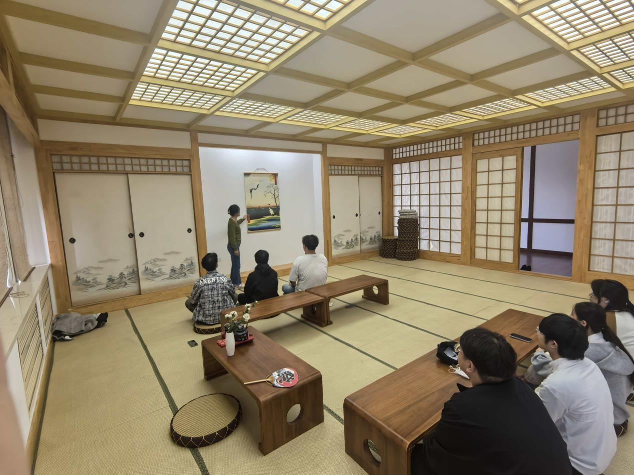 文化体验最后的角色扮演环节,同学们已经能够熟练地指认和室的各个部分,并用日语进行简单介绍。更重要的是,同学们充分理解了蕴含在和室中的日本美学——侘寂之美,其蕴含的无常、残缺与寂静的禅意,追求枯淡简素、与自然的浑然和谐以及待客之心。一位同学在体验后感慨道:“以前这些词汇只是课本上的符号,今天却能坐在真正的‘畳’上感受它们的气息和温度,这种体验令人难忘!”