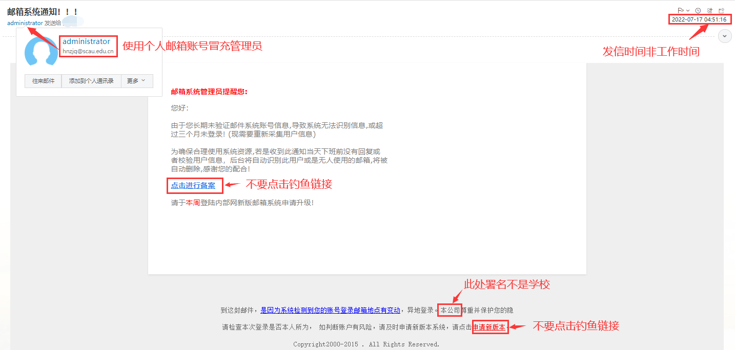 1.不要轻信发件人地址中显示的“显示名”。因为显示名实际上是可以随便设置的,要注意阅读发件邮箱全称。