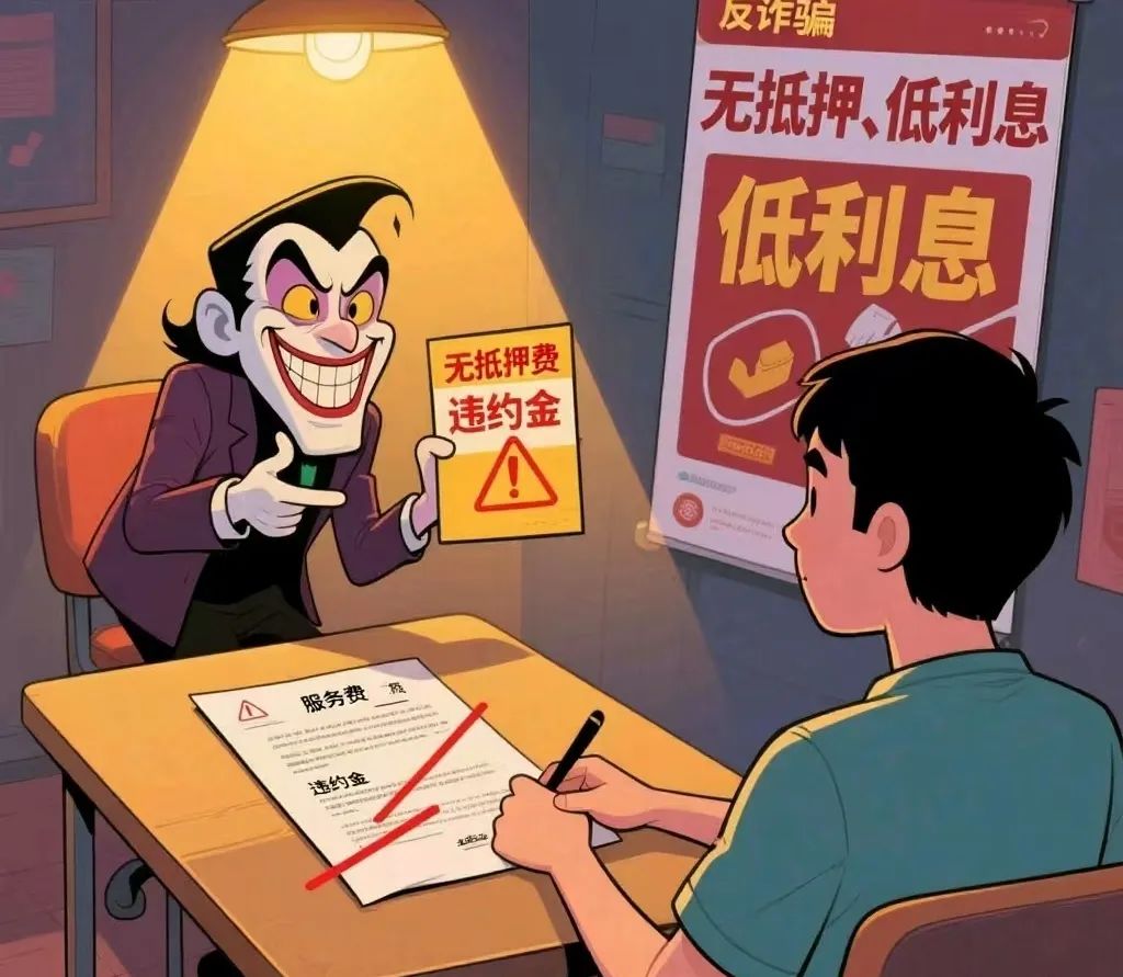 一、骗子常以“无抵押、低利息”为幌子吸引你。签约时暗藏“服务费”“违约金”等高额费用,周息、月息远超法定标准。